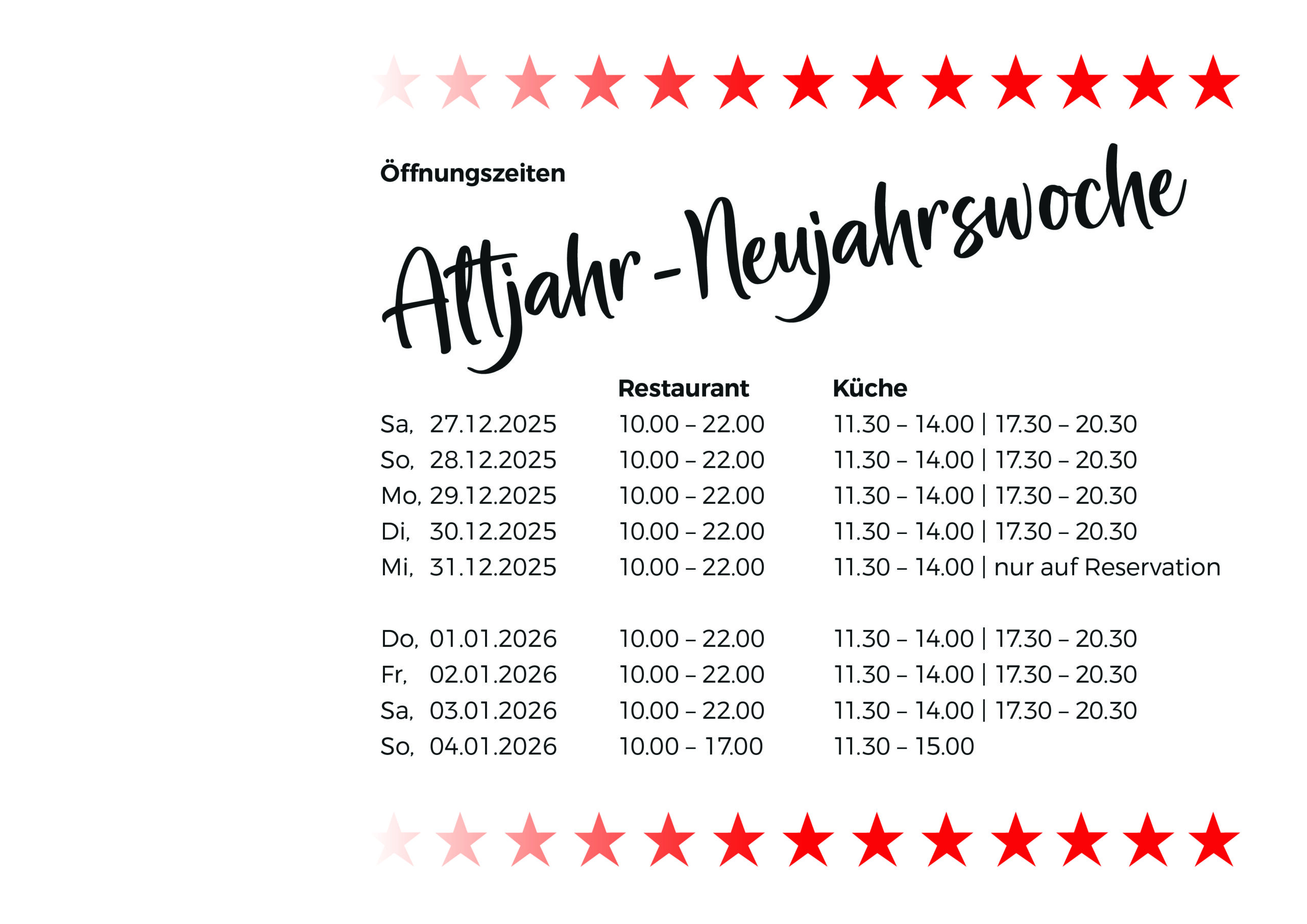 geschlossengeschlossen11:30 – 13:30 | 17:30 – 20:0011:30 – 13:30 | 17:30 – 20:0011:30 – 13:30 | 17:30 – 20:3011:30 – 13:30 | 17:30 – 20:3011:30 – 15:00